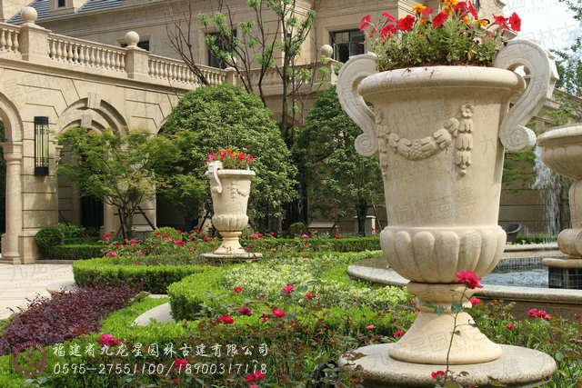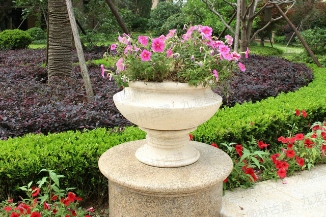 石材花缽可放在臺階或小區(qū)入口兩側(cè),屹立于景墻之上,廣場的中心,水池邊上,單元入口或擺放于街邊。既可以獨自成景,與水中的倒影交相輝映,又可以和噴泉一道形成優(yōu)美的旋律。