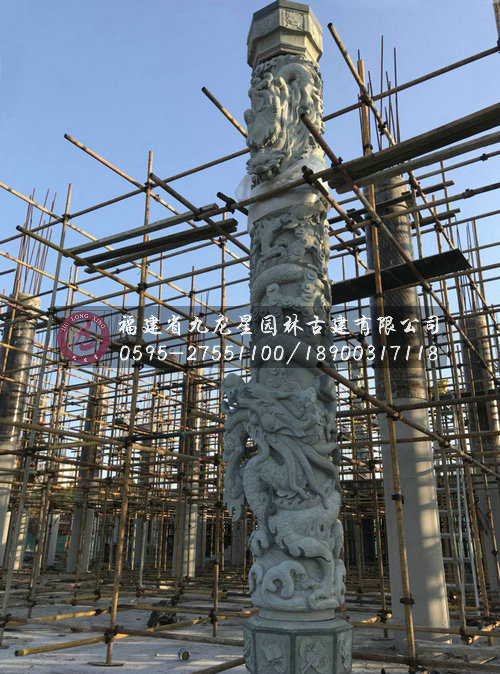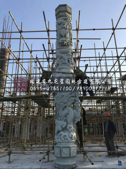 龍柱就是柱子上雕有蟠龍,雕龍柱大多采用浮雕,蟠龍的形象比較突出,而其中最為精彩的是高浮雕手法雕制而成的龍柱,龍紋更具立體感,更為生動(dòng)。九龍星園林古建雕刻的龍柱龍形生動(dòng)如生,雕刻技藝精湛。